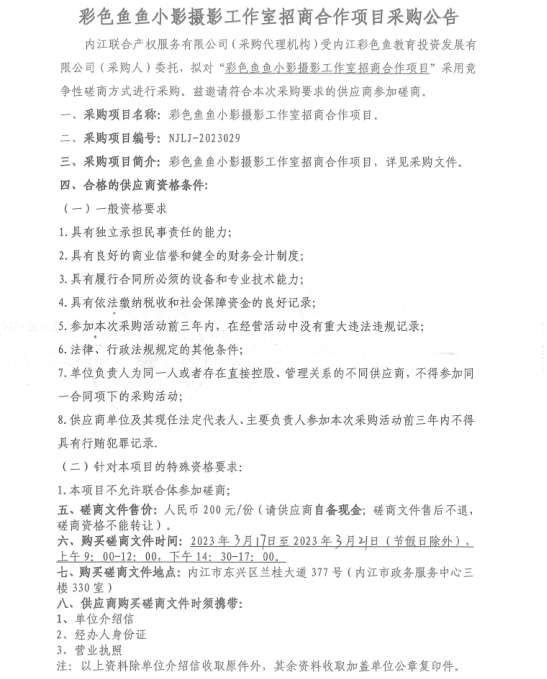 彩色魚魚小影攝影工作室招商合作項(xiàng)目采購公告