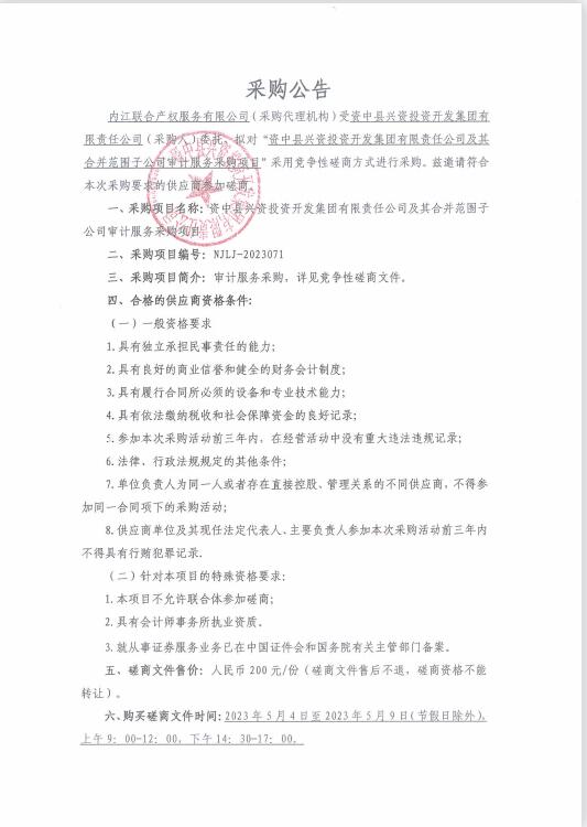 資中縣興資投資開發(fā)集團(tuán)有限責(zé)任公司及其合并范圍子公司審計(jì)服務(wù)采購(gòu)項(xiàng)目采購(gòu)公告