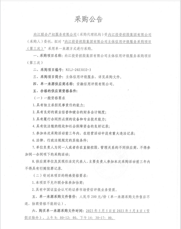 內(nèi)江投資控股集團(tuán)有限公司主體信用評(píng)級(jí)服務(wù)采購(gòu)項(xiàng)目(第三次)采購(gòu)公告
