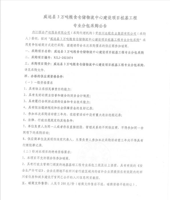 威遠(yuǎn)縣3萬噸糧食倉儲(chǔ)物流中心建設(shè)項(xiàng)目樁基工程專業(yè)分包采購公告