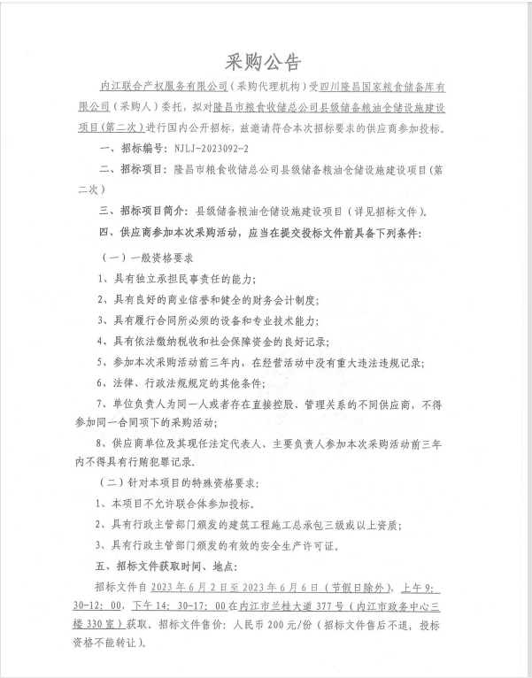 隆昌市糧食收儲總公司縣級儲備糧油倉儲設施建設項目(第二次)采購公告