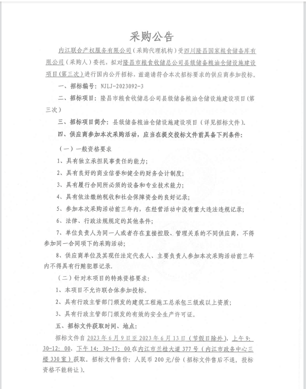 隆昌市糧食收儲總公司縣級儲備糧油倉儲設(shè)施建設(shè)項目(第三次)采購公告