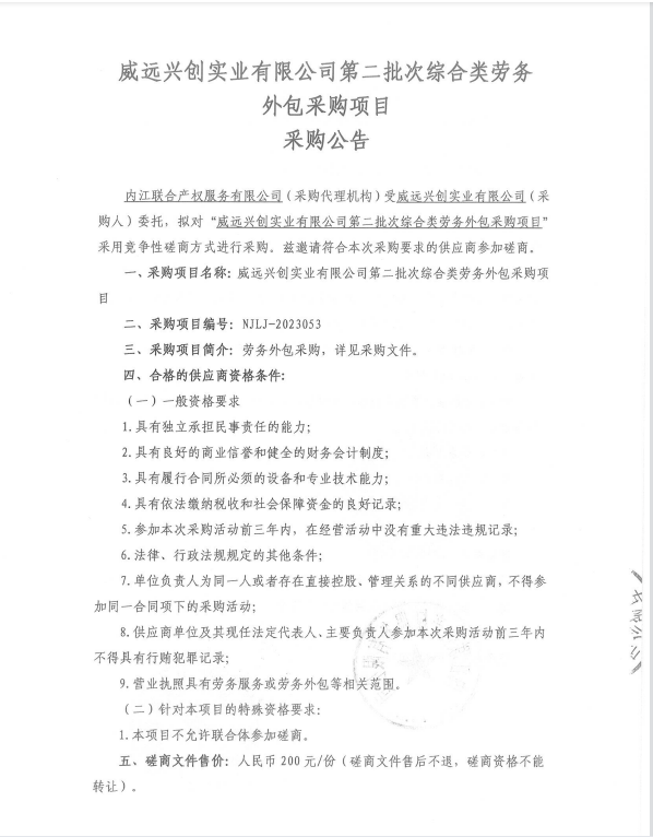 威遠(yuǎn)興創(chuàng)實(shí)業(yè)有限公司第二批次綜合類勞務(wù)外包采購(gòu)項(xiàng)目采購(gòu)公告