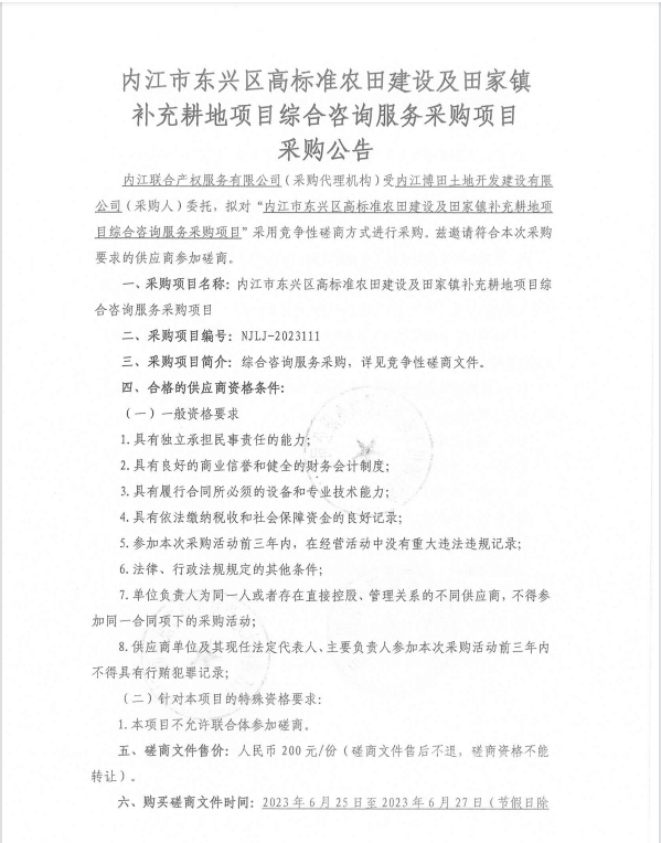 內(nèi)江市東興區(qū)高標(biāo)準(zhǔn)農(nóng)田建設(shè)及田家鎮(zhèn)補(bǔ)充耕地項(xiàng)目綜合咨詢服務(wù)采購(gòu)項(xiàng)目采購(gòu)公告