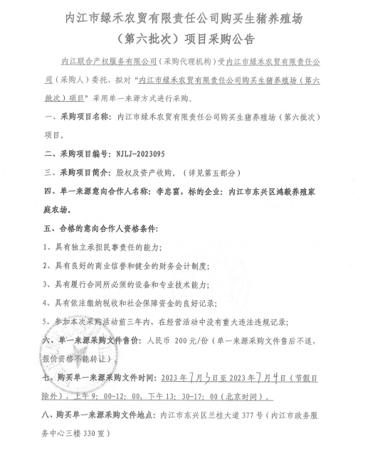 內(nèi)江市綠禾農(nóng)貿(mào)有限責(zé)任公司購(gòu)買(mǎi)生豬養(yǎng)殖場(chǎng)(第六批次)項(xiàng)目采購(gòu)公告