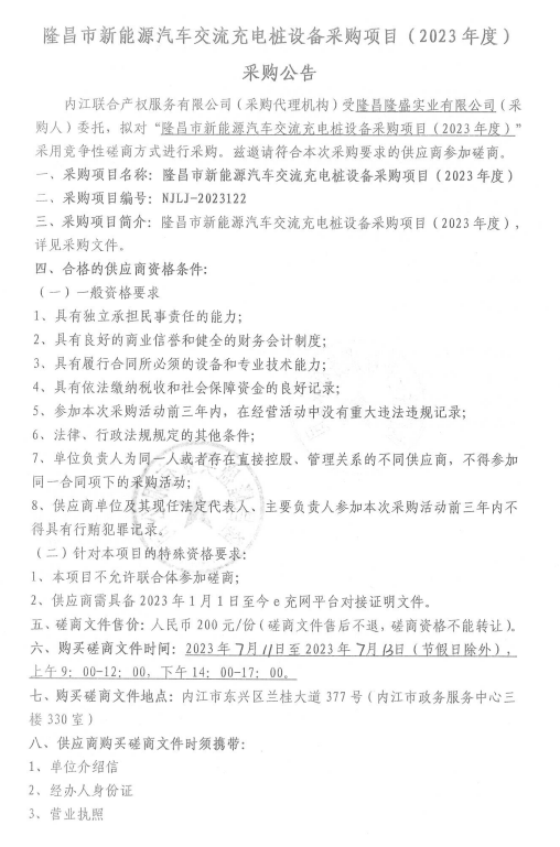 隆昌市新能源汽車交流充電樁設(shè)備采購項目(2023年度)采購公告
