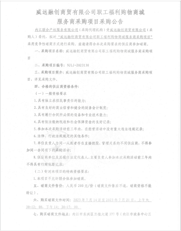 威遠(yuǎn)融創(chuàng)商貿(mào)有限公司職工福利購物商城服務(wù)商采購項(xiàng)目采購公告