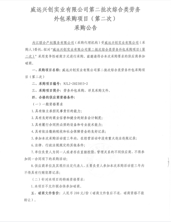威遠興創(chuàng)實業(yè)有限公司第二批次綜合類勞務(wù)外包采購項目(第二次)采購公告