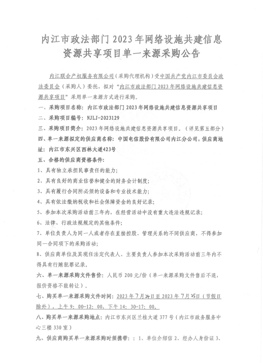 內(nèi)江市政法部門2023年網(wǎng)絡(luò)設(shè)施共建信息資源共享項(xiàng)目單一來源采購公告