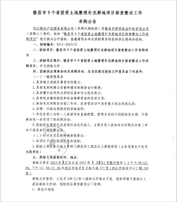 隆昌市9個(gè)省投資土地整理補(bǔ)充耕地項(xiàng)目排查整治工作采購(gòu)公告