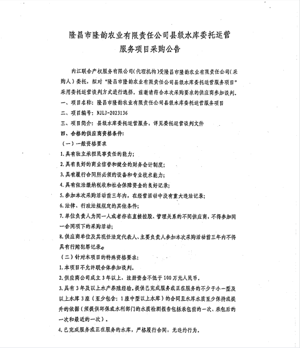 隆昌市隆韻農(nóng)業(yè)有限責(zé)任公司縣級水庫委托運營服務(wù)項目采購公告
