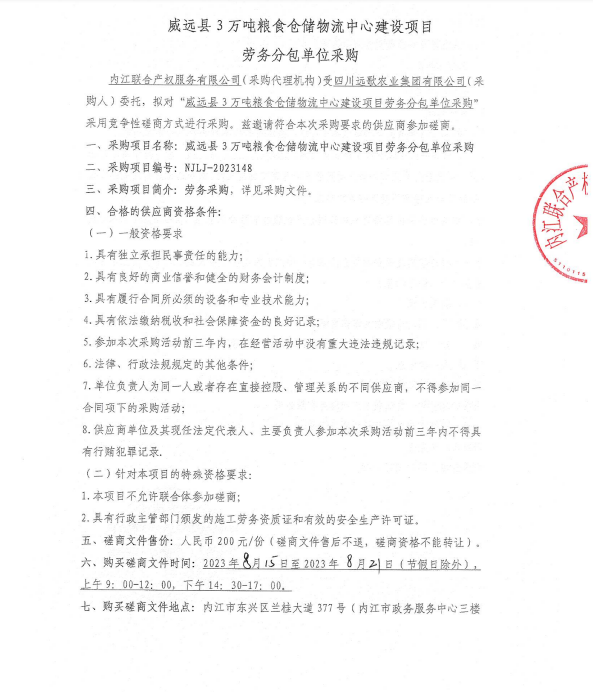 威遠(yuǎn)縣3萬噸糧食倉儲物流中心建設(shè)項(xiàng)目勞務(wù)分包單位采購公告
