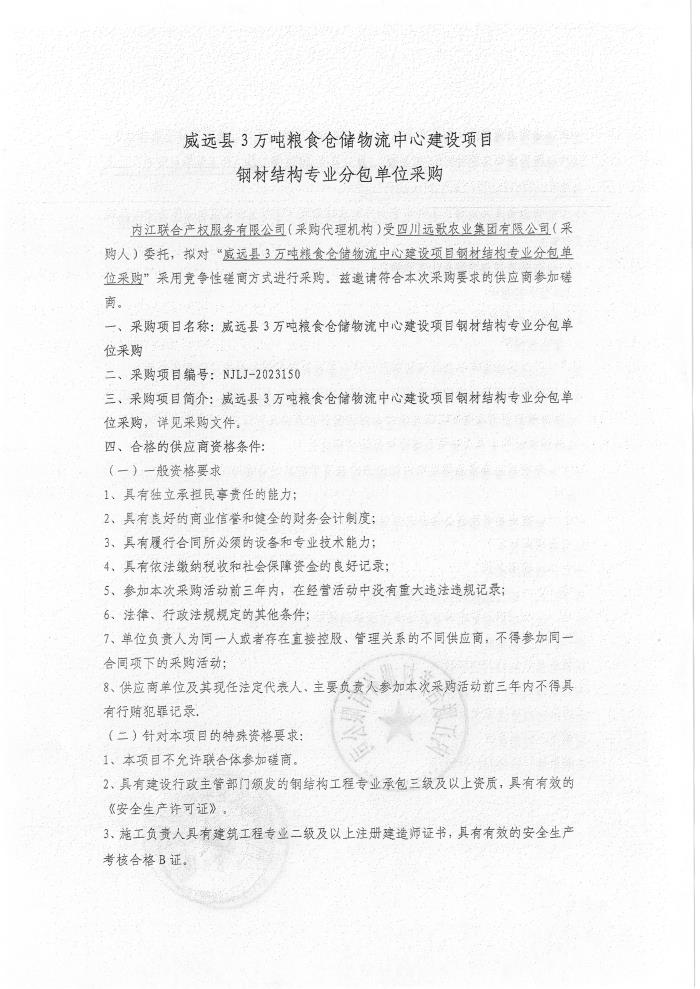 威遠縣3萬噸糧食倉儲物流中心建設(shè)項目鋼材結(jié)構(gòu)專業(yè)分包單位采購公告
