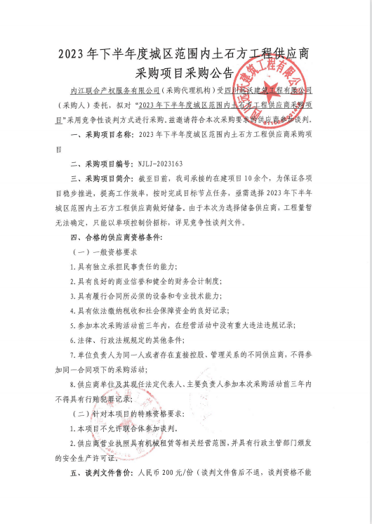 2023年下半年度城區(qū)范圍內(nèi)土石方工程供應商采購項目采購公告