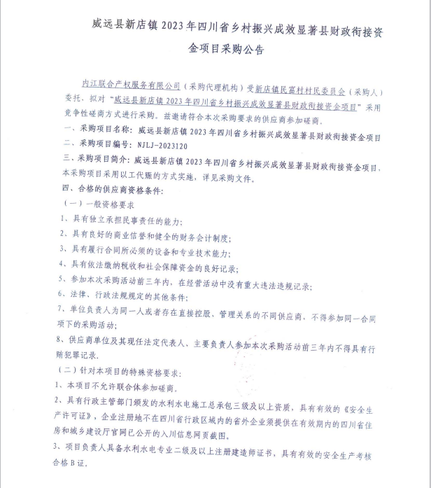 威遠縣新店鎮(zhèn)2023年四川省鄉(xiāng)村振興成效顯著縣財政銜接資金項目采購公告