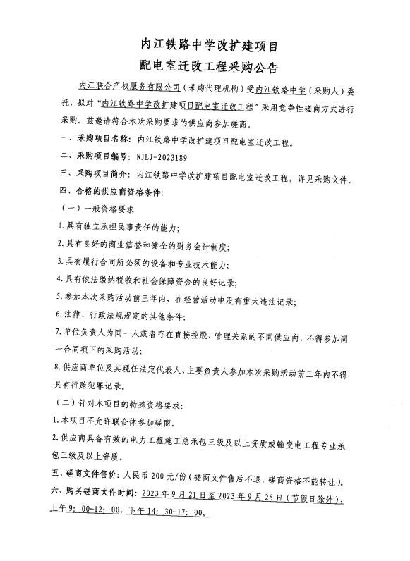 內(nèi)江鐵路中學(xué)改擴建項目配電室遷改工程采購公告