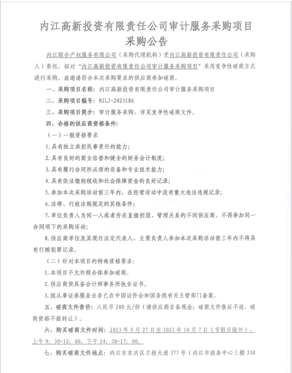 內(nèi)江高新投資有限責(zé)任公司審計(jì)服務(wù)采購(gòu)項(xiàng)目采購(gòu)公告