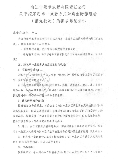 內(nèi)江市綠禾農(nóng)貿(mào)有限責任公司購買生豬養(yǎng)殖場(第九批次)的征求意見公示