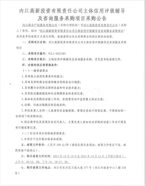 內(nèi)江高新投資有限責任公司主體信用評級輔導及咨詢服務采購項目采購公告