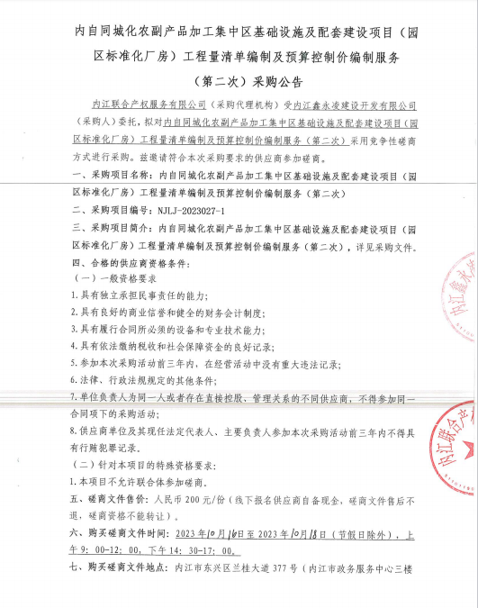 內(nèi)自同城化農(nóng)副產(chǎn)品加工集中區(qū)基礎(chǔ)設(shè)施及配套建設(shè)項(xiàng)目(園區(qū)標(biāo)準(zhǔn)化廠房)工程量清單編制及預(yù)算控制價(jià)編制服務(wù)(第二次)采購(gòu)公告