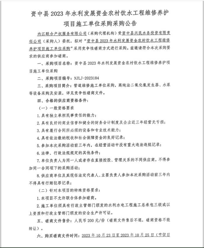 資中縣2023年水利發(fā)展資金農(nóng)村飲水工程維修養(yǎng)護(hù)項(xiàng)目施工單位采購(gòu)采購(gòu)公告