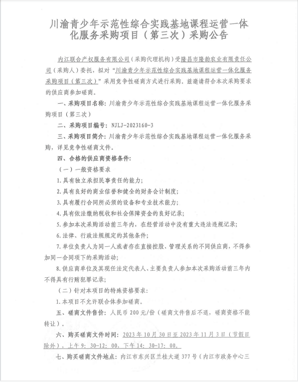 川渝青少年示范性綜合實(shí)踐基地課程運(yùn)營(yíng)一體化服務(wù)采購(gòu)項(xiàng)目(第三次)采購(gòu)公告