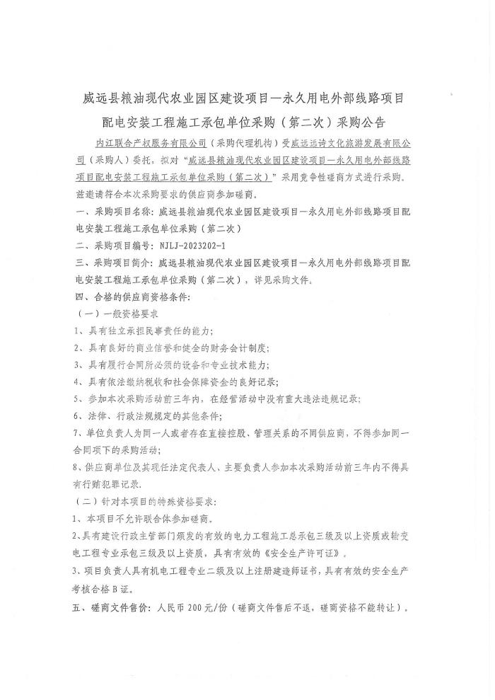 威遠(yuǎn)縣糧油現(xiàn)代農(nóng)業(yè)園區(qū)建設(shè)項目—永久用電外部線路項目配電安裝工程施工承包單位采購(第二次)采購公告