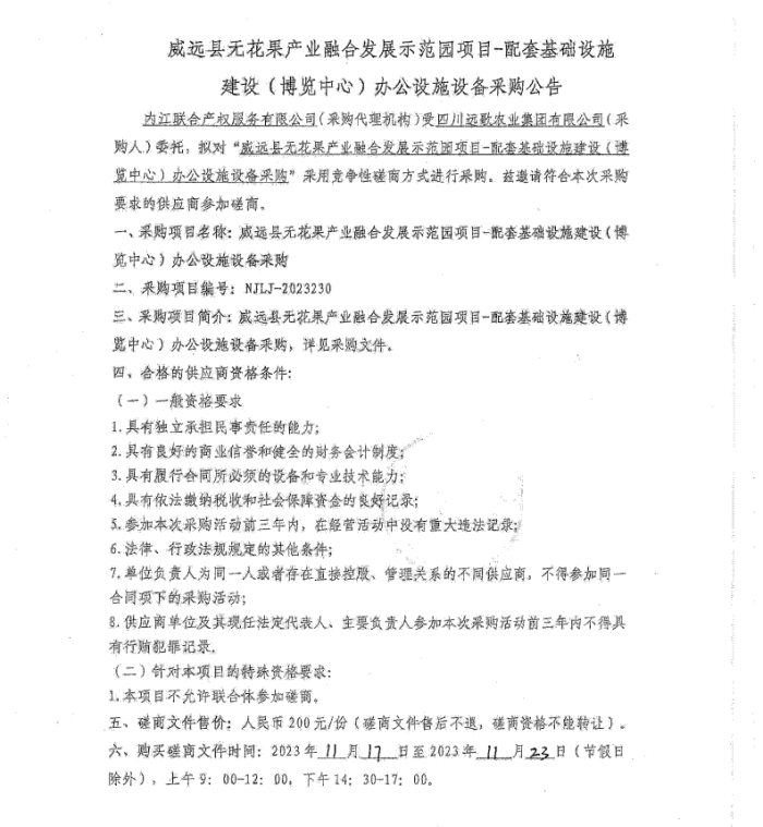 威遠(yuǎn)縣無花果產(chǎn)業(yè)融合發(fā)展示范園項目-配套基礎(chǔ)設(shè)施建設(shè)(博覽中心)辦公設(shè)施設(shè)備采購公告