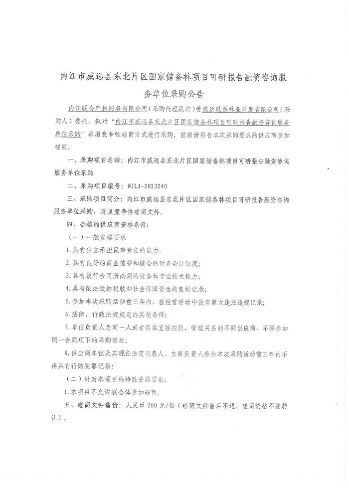 內(nèi)江市威遠縣東北片區(qū)國家儲備林項目可研報告融資咨詢服務(wù)單位采購公告