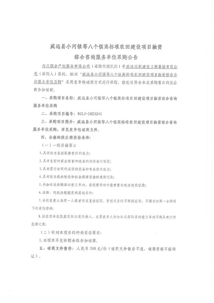 威遠縣小河鎮(zhèn)等八個鎮(zhèn)高標準農(nóng)田建設項目融資綜合咨詢服務單位采購公告