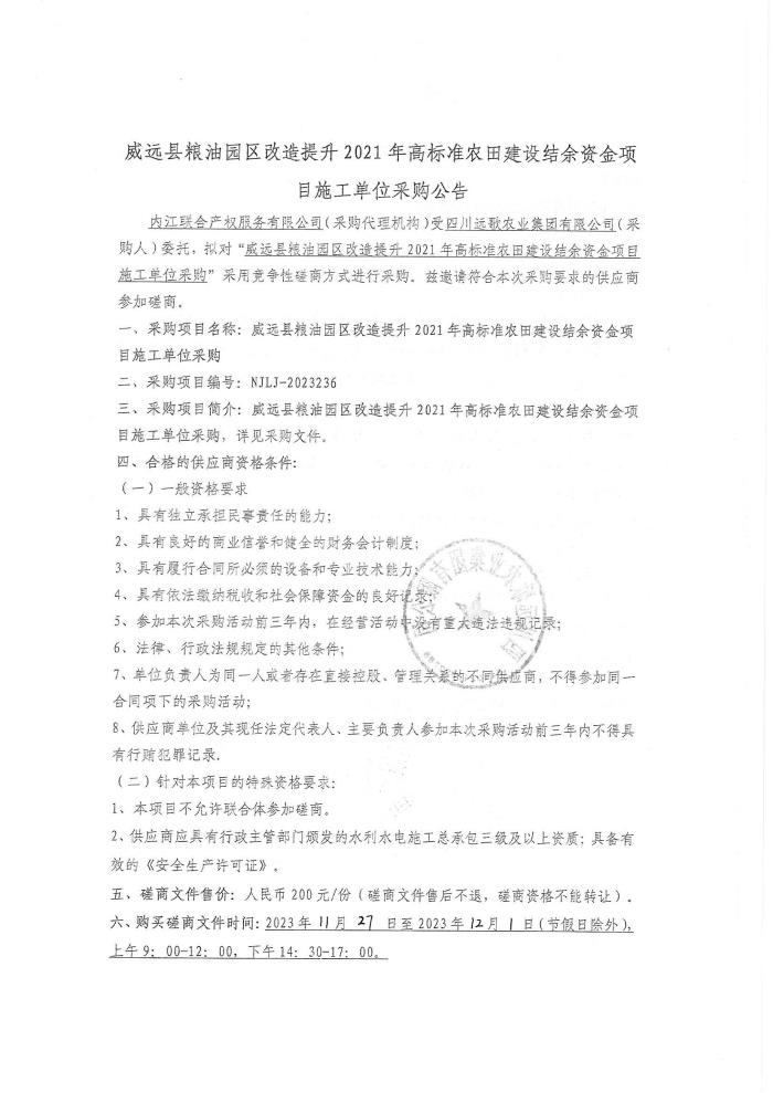 威遠(yuǎn)縣糧油園區(qū)改造提升2021年高標(biāo)準(zhǔn)農(nóng)田建設(shè)結(jié)余資金項(xiàng)目施工單位采購公告