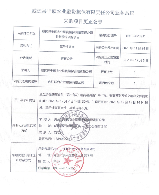 威遠(yuǎn)縣豐碩農(nóng)業(yè)融資擔(dān)保有限責(zé)任公司業(yè)務(wù)系統(tǒng)采購(gòu)項(xiàng)目更正公告