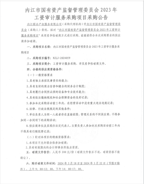 內(nèi)江市國有資產(chǎn)監(jiān)督管理委員會(huì)2023年工資審計(jì)服務(wù)采購項(xiàng)目采購公告