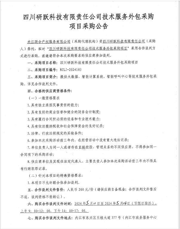 四川研躍科技有限責任公司技術服務外包采購項目采購公告