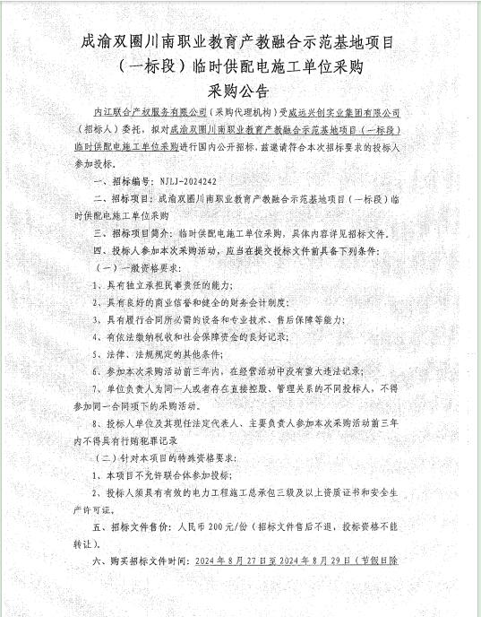 成渝雙圈川南職業(yè)教育產(chǎn)教融合示范基地項(xiàng)目(一標(biāo)段)臨時(shí)供配電施工單位采購(gòu)采購(gòu)公告