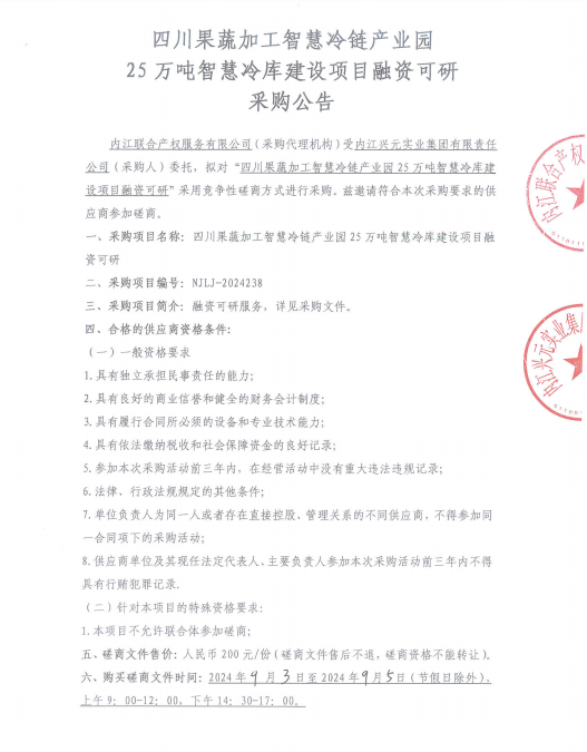四川果蔬加工智慧冷鏈產(chǎn)業(yè)園25萬噸智慧冷庫建設(shè)項(xiàng)目融資可研采購公告