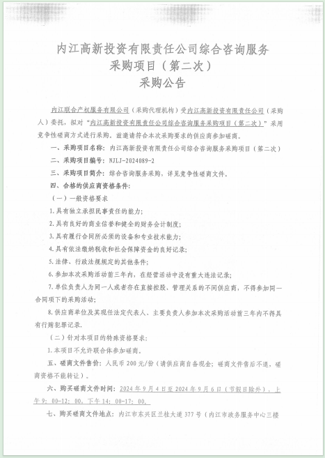 內(nèi)江高新投資有限責(zé)任公司綜合咨詢服務(wù)采購項(xiàng)目(第二次)采購公告