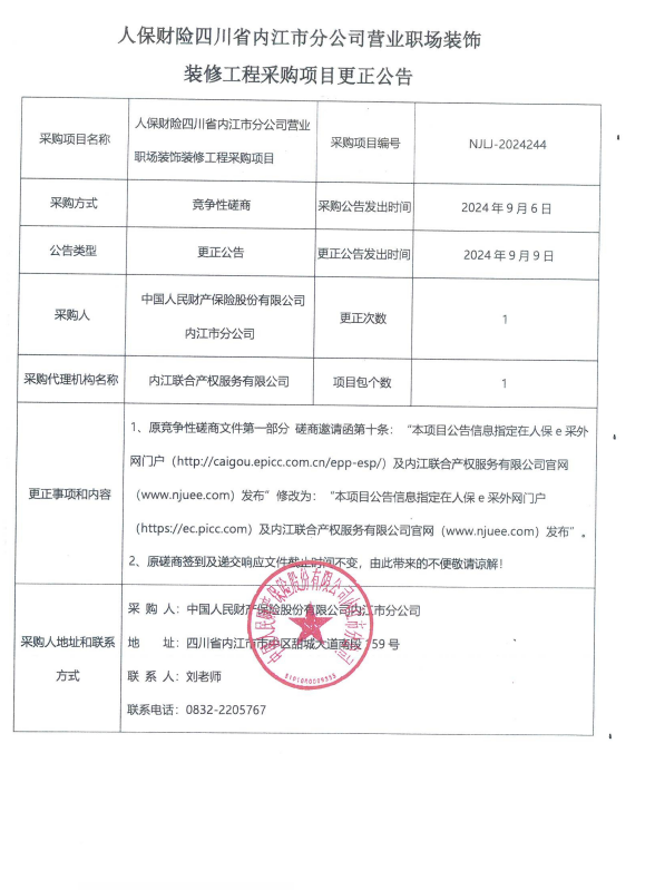 人保財險四川省內(nèi)江市分公司營業(yè)職場裝飾裝修工程采購項目更正公告
