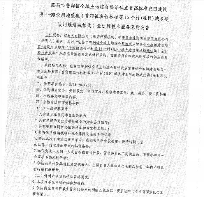 隆昌市普潤鎮(zhèn)全域土地綜合整治試點暨高標準農田建設項目-建設用地整理(普潤鎮(zhèn)斑竹林村等15個村(社區(qū))城鄉(xiāng)建設用地增減掛鉤)全過程技術服務采購公告