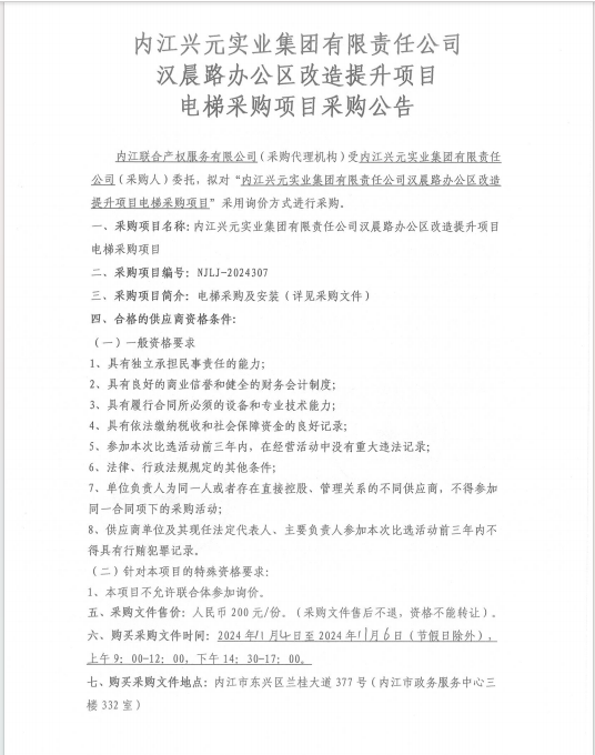 內(nèi)江興元實業(yè)集團有限責任公司漢晨路辦公區(qū)改造提升項目電梯采購項目采購公告