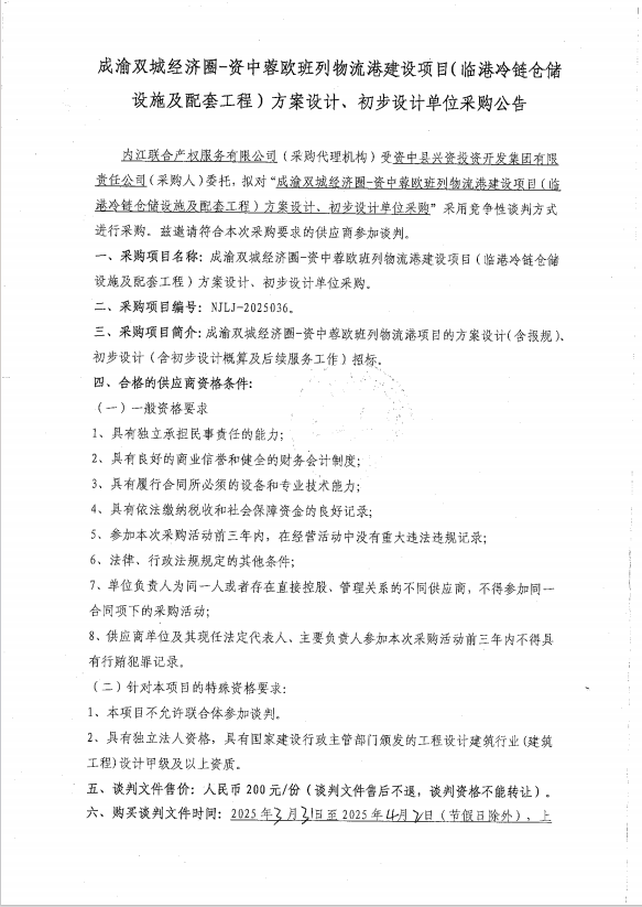 成渝雙城經(jīng)濟(jì)圈-資中蓉歐班列物流港建設(shè)項(xiàng)目(臨港冷鏈倉(cāng)儲(chǔ)設(shè)施及配套工程)方案設(shè)計(jì)、初步設(shè)計(jì)單位采購(gòu)公告