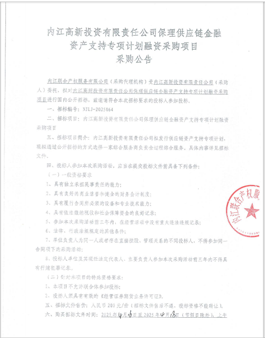內(nèi)江高新投資有限責(zé)任公司保理供應(yīng)鏈金融資產(chǎn)支持專項計劃融資采購項目采購公告