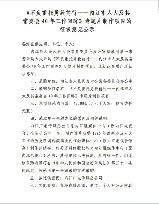 《不負(fù)重托勇毅前行——內(nèi)江市人大及其常委會(huì)40年工作回眸》專題片制作項(xiàng)目的征求意見(jiàn)公示