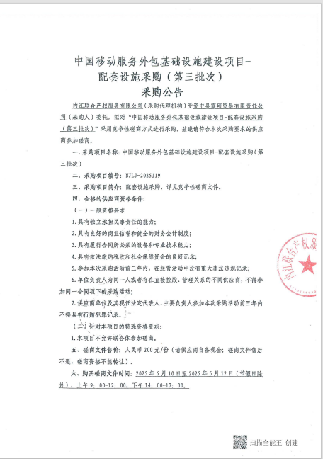 中國移動服務(wù)外包基礎(chǔ)設(shè)施建設(shè)項目-配套設(shè)施采購(第三批次)采購公告