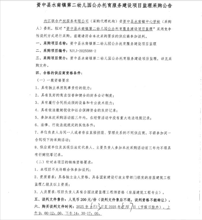 資中縣水南鎮(zhèn)第二幼兒園公辦托育服務(wù)建設(shè)項(xiàng)目監(jiān)理采購(gòu)公告