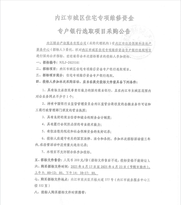 內(nèi)江市城區(qū)住宅專項(xiàng)維修資金專戶銀行選取項(xiàng)目采購公告