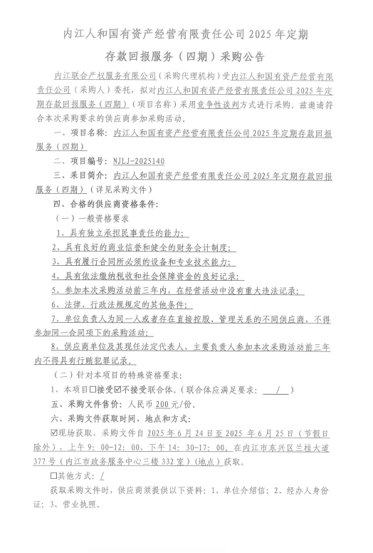 內(nèi)江人和國(guó)有資產(chǎn)經(jīng)營(yíng)有限責(zé)任公司2025年定期存款回報(bào)服務(wù)(四期)