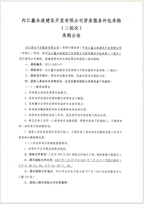 內(nèi)江鑫永凌建設(shè)開發(fā)有限公司勞務(wù)服務(wù)外包采購(二批次)采購公告