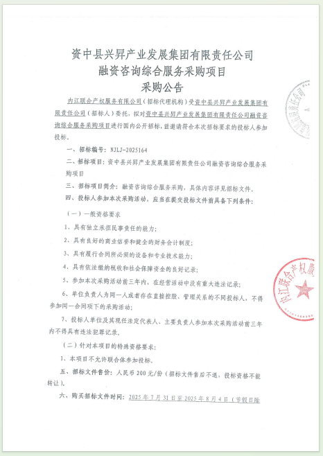 資中縣興昇產業(yè)發(fā)展集團有限責任公司融資咨詢綜合服務采購項目采購公告