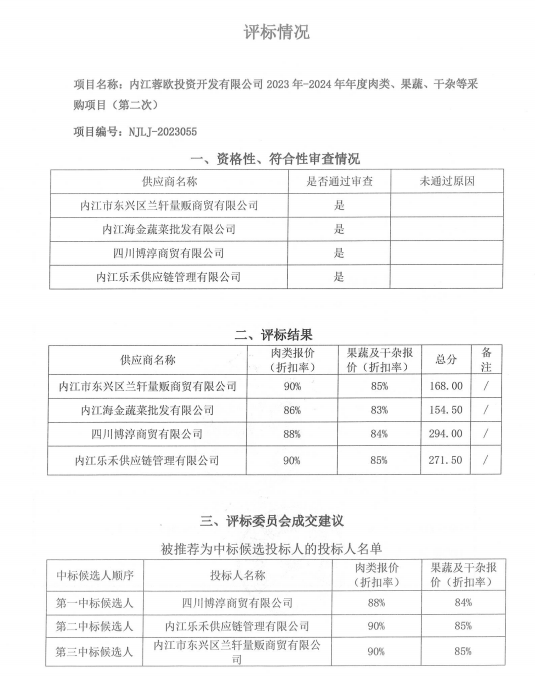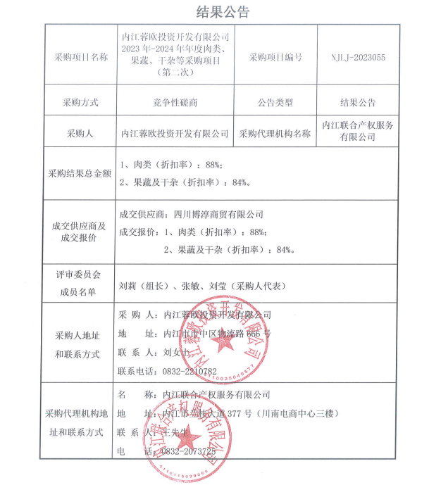 內(nèi)江蓉歐投資開發(fā)有限公司2023年-2024年年度肉類、果蔬、干雜等采購項目(第二次)結(jié)果公告